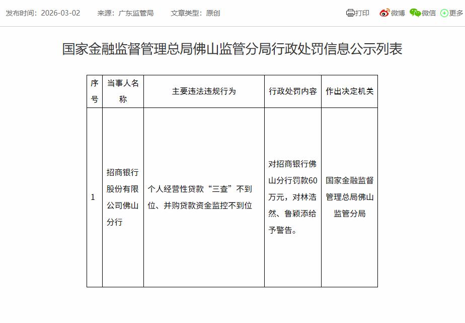 罚款60万!佛山市某银行受到行政处罚。